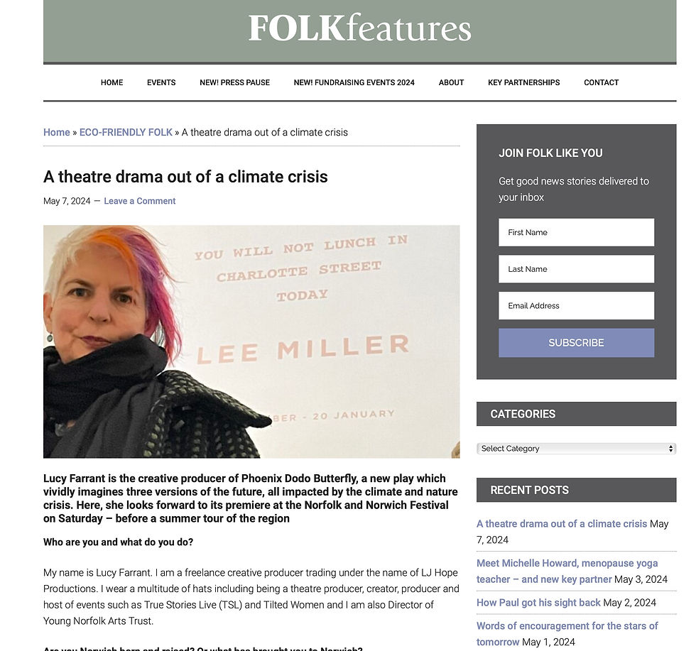 Lucy Farrant was interviewed by Folk Features about her career and involvement with Phoenix, Dodo, Butterfly.Click here to read the full story.